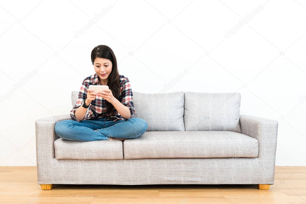 Elegant girl on sofa light background.